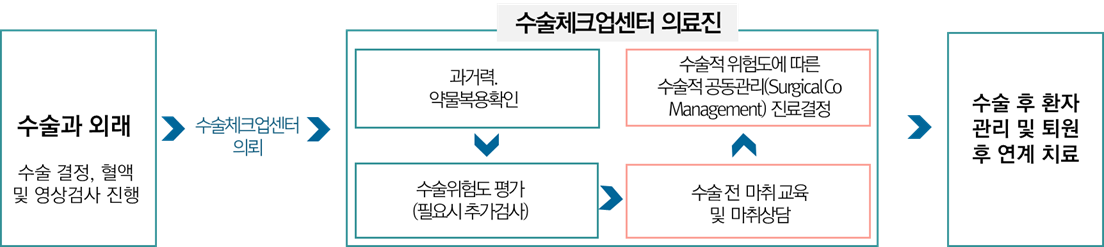 본 센터는 수술 전 환자의 건강 상태를 종합적으로 평가하고, 수술에 영향을 미칠 수 있는 위험요인을 사전에 관리함으로 수술 중·후 발생할 수 있는 합병증 예방과 조기 회복을 목표로 하고 있습니다.